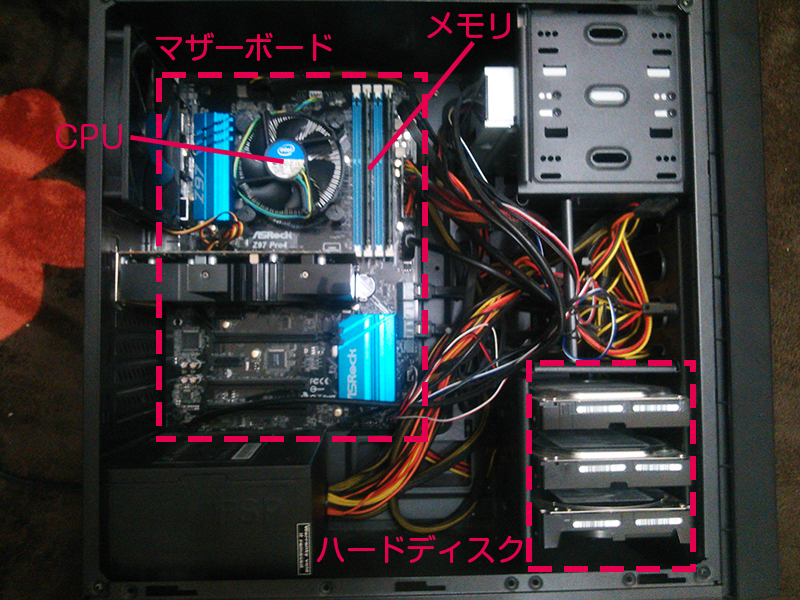 マザーボードがあって、そこにCPUなど必要なパーツがあって、