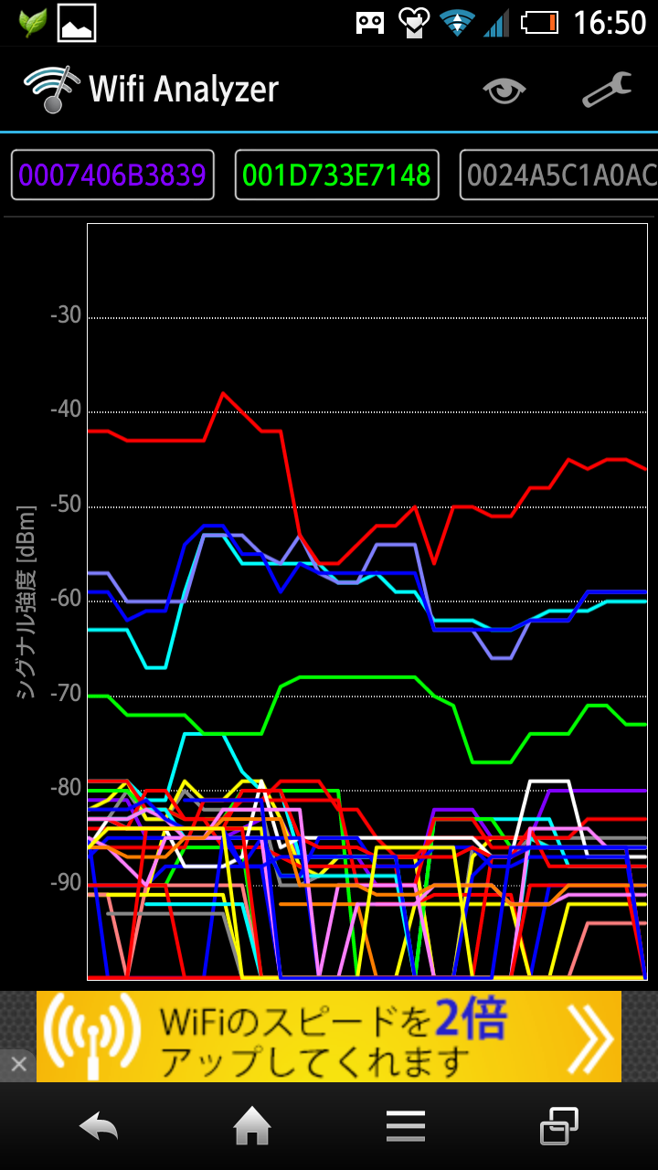 線グラフで表示した結果。弱い電波、つまり遠くにあったり、何枚も壁や天井を隔てた先にあったりする電波が、これだけ大量にあるようです。もはや数えることもできない!